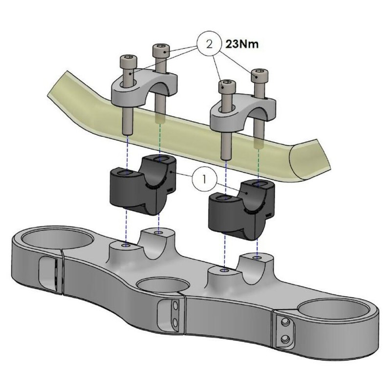 The risers are mounted between the handlebars and the existing risers. Installed in minutes.