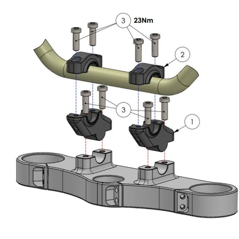 The risers are mounted between the handlebars and the existing risers. Installed in minutes.
